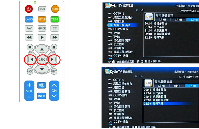 第一步: 在“中文頻道列表”頁用“上下鍵”選擇頻道後,按 鍵的進入頻道節目單